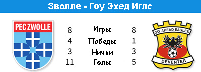 На небольшом стадионе "Эйсселделта" состоится бескомпромиссное Эйсельское дерби между "Зволле" Рона Янса и "Гоу Эхед Иглс" Фуке Боя. Их очная встреча всегда сопровождалась множеством забавных околофутбольных историй. За примером даже далеко ходить не нужно, достаточно отмотать память до матча команд в первом круге в Девентере, когда хозяева вынуждены были перепрятать свой талисман орла Харли - такой была реакция на слухи о возможном его похищении фанатами "Синих пальцев". Но всё же перейдём к делам футбольным. "Гоу Эхед Иглс" в прошлом туре впервые за 19 матчей сыграли на ноль, неожиданно обыграв "Твенте". Всего в активе "Орлов" это вторая сухая игра в сезоне. Что касается "Зволле", то коллективу Рона Янса в прошлом туре предстояло сыграть на выезде с "Херенвеном". Для наставника "синих пальцев" тот матч был особенным, ведь он по праву для всех болельщиков "Херенвена" является легендой, которая в данный момент по другую сторону баррикад. Кстати, это был первый визит Янса в Херенвен после возвращения в голландский футбол. Однако добыть очки в Херенвене Рону Янсу и его "Зволле" не удалось, в достаточно интересном и обоюдоостром матче "Синие пальцы" были разгромлены "Фризами" и продлили свою серию без побед до пяти матчей.