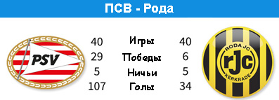 | Статистика встреч: 54-19-20 (202:107) | | Сезон 2013/2014 | | 27.10.2013 Рода - ПСВ Эйндховен - 2:1 | | | | Сезон 2012/2013 | | 31.03.2013 Рода - ПСВ Эйндховен - 2:2 | | 18.08.2012 ПСВ Эйндховен - Рода - 5:0 | | | | Сезон 2011/2012 | | 29.04.2012 Рода - ПСВ Эйндховен - 1:3 | | 24.09.2011 ПСВ Эйндховен - Рода - 7:1 | | | | Сезон 2010/2011 | | 19.12.2010 ПСВ Эйндховен - Рода - 3:1 | | 14.08.2010 Рода - ПСВ Эйндховен - 0:0 | | | | Сезон 2009/2010 | | 19.01.2010 Рода - ПСВ Эйндховен - 0:1 | | 12.09.2009 ПСВ Эйндховен - Рода - 3:0 | |