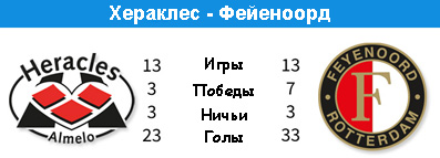 | Статистика встреч: 4-6-17 (36:87) | | Сезон 2013/2014 | | 27.10.2013 Фейеноорд - Хераклес - 1:2 | | | | Сезон 2012/2013 | | 28.04.2013 Фейеноорд - Хераклес - 6:0 | | 26.08.2012 Хераклес - Фейеноорд - 1:2 | | | | Сезон 2011/2012 | | 02.05.2012 Фейеноорд - Хераклес - 4:1 | | 21.08.2011 Хераклес - Фейеноорд - 1:1 | | | | Сезон 2010/2011 | | 12.02.2011 Фейеноорд - Хераклес - 2:1 | | 22.08.2010 Хераклес - Фейеноорд - 1:1 | | | | Сезон 2009/2010 | | 14.03.2010 Фейеноорд - Хераклес - 1:1 | | 16.08.2009 Хераклес - Фейеноорд - 0:1 | |