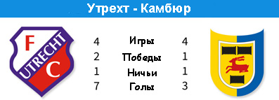 | Статистика встреч: 3-2-4 (15:14) | | Сезон 2013/2014 | | 26.10.2013 Камбюр - Утрехт - 3:1 | | | | Сезон 1999/2000 | | 02.04.2000 Утрехт - Камбюр - 1:2 | | 01.12.1999 Камбюр - Утрехт - 4:3 | | | | Сезон 1998/1999 | | 02.12.1998 Камбюр - Утрехт - 1:1 | | 30.08.1998 Утрехт - Камбюр - 3:0 | |