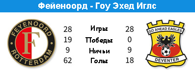Не теряет надежд побороться за второе место "Фейеноорд", который хоть и откатился на пятую строчку, но лишь потому, что у конкурентов из Эйндховена и Арнема перед этим туром было на одну проведенную игру больше. В домашнем матче с "Гоу Эхед Иглс" "Тараканы" будут фаворитами - "Фейе" на "Де Кейпе" чувствует себя уверенно, а "Орлы" в таблице гостевых матчей расположились в самом конце. Куман по-прежнему будет обходиться без услуг Грациано Пелле, который на днях вляпался в очередную историю (приехал на тренировку на Феррари, хотя контракт обязывает использовать автомобиль официального спонсора Опель), но это тренера не смущает. Похоже, он нашел способ, как побеждать без итальянца, ведь "Фейе" без Грациано уверенно выиграл уже два матча. Напомним, что в первом круге команды очки поделили - была зафиксирована боевая ничья 2:2.