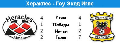 За последние несколько лет позиции "Хераклеса" стали уже привычными. Команда стабильно располагается в середине турнирной таблицы, даже не смотря на кадровые потери, в виде трансферов игроков в другие команды. И тренера альмельцы поменяли в начале этого сезона (Петер Бош пошёл на повышение в "Витесс"), но даже этот факт не сгубил "гераклов", располагающихся на десятой строчке. В случае победы над "Гоу Эхед Иглс" команда Яна де Йонге даже имеет шанс опередить "Зволле", который вчера уступил "Гронингену". "Конечно мы мечтаем попасть в плей-офф и наши шансы ещё не потеряны, но для начала мы должны сосредоточиться на игре с "Гоу Эхед Иглс". У них идут очень хорошо дела в этом сезоне. Дома они всегда играют в очень агрессивный и атакующий футбол, но и на выездах они достигли несколько хороших результатов", - сказал наставник "Хераклеса" перед матчем. Действительно, "Гоу Эхед Иглс" команда домашняя не меньше, чем другой новичок элиты в этом сезоне "Камбюр". Три четверти набранных "Орлами" балов пришлись на домашние матчи, что должно помочь сохранить прописку. Ко всему прочему, в поединках с конкурентами в борьбе за выживание команда Фуке Боя проиграла всего два матча из девяти. Учитывая, что "Орлам" из Девентера предстоит в последнем туре сразиться с "Родой", эта статистика весьма актуальна.