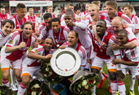 Благодаря ничьей в Альмело "Аякс" стал чемпионом четвертый раз подряд, а Франк де Бур вписал своё имя в историю, поскольку никогда ранее один тренер не завоёвывал четыре чемпионских титула подряд в Эредивизи. В любом случае, осадок по итогам сезона у амстердамцев останется - это крупное поражение от "Зволле" на прошлой неделе в финале Кубка Голландии. Так называемого дубля сделать не удалось, но чемпионский титул, однозначно, важнее. Серьёзных корректировок в стартовом составе своей команды Франк де Бур делать не стал. В основу вернулся голкипер Яспер Силессен. Все мы знаем, что Вермер выходит только на кубковые матчи, а ещё одно изменение коснулось центра обороны, где появился Велтман вместо травмированного Мойсандера. Кстати финн, откровенно провалил кубковый матч, но не появился в обойме не по этой причине. Да и появление в Кубке было ошибкой Де Бура, поскольку тонуса после травмы Мойсандеру явно не хватало. В остальном состав "аяксидов" был тем же. А вот хозяева перед этим матчем потеряли сразу ряд основных игроков, причём преимущественно из-за дисквалификаций. В итоге, Яну де Йонге даже пришлось выпустил немца Драгана Пальича, который заодно и дебютировал в нынешнем сезоне. В воротах привычно располагался капитан Ремко Пасвеер, который, судя по всему, провёл свой последний домашний матч за "Хераклес". Как стало известно, голкипер покинет Альмело по итогам этого сезона и возможно переберётся в какой-то другой клуб из Нидерландов на правах свободного агента. Что касается игры, то ещё в первом тайме результат матча был сделан. Причём, что любопытно, команды обменялись красивыми голами со штрафных. У амстердамцев забил Лассе Шёне, а у "Хераклеса" нашёлся свой мастер стандартов Симон Циоммер. Второй тайм и вовсе стал формальностью. Обеих коллективов устраивала ничья, а поэтому лезть на рожон никто не собирался. Разве что Кркич уже ближе к концу матча мог украсить чемпионство своей команды победой. Итоговая ничья зафиксировала 33 чемпионство "Аякса" и четвёртое кряду.