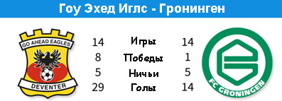 "Гронинген" в прошлом туре потерпел первое поражение. Ничего катастрофического в этом поражении "зелёно-белых" нет, для такой команды это абсолютно нормальное, не выходящее из ряда вон, событие. Однако, "северяне" сами задали тон сезону, одержав в первом туре самую яркую победу. Затем был успех в матче с "Утрехтом", но не столь впечатляющий, а теперь вот и поражение. Сейчас можно поправить своё положение победой над другим новичком элиты - команду Эрвина ван де Лооя ждёт в гости "Гоу Эхед Иглс". А можно ли? На самом деле "Орлы" не такой уж простой соперник. Даже проиграв в прошедшем туре ПСВ, команда Фуке Боя здорово смотрелась в первом тайме и отчасти из-за банального недостатка удачи не смогла пробить Зута. Тем не менее, до этого девентерцы без проблем справлялись с "Утрехтом" и "Ден Хаагом", что было куда более наглядным подтверждением силы "Гоу Эхед Иглс". Этот коллектив не отсиживается в обороне и смело рвётся в атаку, а потому защитникам "Гронингена" придётся попотеть. Что из этого получится, увидим.