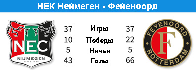 | НЕК НЕЙМЕГЕН - ФЕЙЕНООРД | 15 сентября. Неймеген. Стадион "Гофферштадион". 14:30. Судья - Кевин Блом (Гауда). | | | В Неймегене сойдутся два, пожалуй, главных неудачника старта сезона в Эре. Впрочем, у "Фейе" уже заметен определенный прогресс, но вот у хозяев поля по-прежнему все очень плохо. И, надо признать, с каждым туром ситуация лучше не становится, хотя первые очки команда все-таки смогла набрать, расписав ничьи с "Валвейком" и "Бредой". Тем не менее, даже этот небольшой успех не дает возможности НЕКу рассчитывать на положительный исход предстоящего матча. Каким бы ни был игровой кризис у "Фейе", команда Рональда Кумана успешно его преодолевает и даже в худшем своем состоянии должна разбираться с отъявленными аутсайдерами. К слову, в прошлом сезоне роттердамцы разбили НЕК на его поле 3:0. Примечательно, что дублем тогда отметился Жан-Поль Боэтиюс, долгожданное возвращение которого ожидается как раз в предстоящей игре. Наверняка, рад этому и Грациано Пелле, которому приходилось уж очень непросто тянуть за собой всю команду в предыдущих турах. В домашнем матче двухнедельной давности с "Родой" "Фейеноорд" наконец-то показал, что и кроме Пелле есть кому делать игру. Сам итальянец также забил, открыв счет классным ударом из-за штрафной, записав на свой счет 19-й мяч в 20-ти играх 2013 года. Две победы кряду, и вместе с неудачной игрой конкурентов положение "Фейе" уже не видится таким безнадежным.
