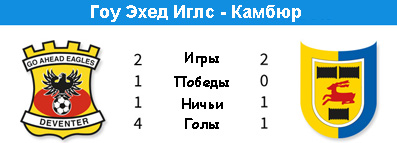 | Статистика встреч: 4-3-3 (18:11) | | Сезон 1993/1994 | | 06.02.1994 Камбюр - Гоу Эхед Иглс - 1:0 | | 05.09.1993 Гоу Эхед Иглс - Камбюр - 3:0 | | | | Сезон 1992/1993 | | 24.01.1993 Камбюр - Гоу Эхед Иглс - 1:1 | | 16.08.1992 Гоу Эхед Иглс - Камбюр - 1:1 | |