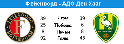 | Статистика встреч: 39-19-20 (162:107) | | Сезон 2012/2013 | | 05.05.2013 АДО Ден Хааг - Фейеноорд - 2:0 | | 16.12.2012 Фейеноорд - АДО Ден Хааг - 3:2 | | | | Сезон 2011/2012 | | 22.04.2012 АДО Ден Хааг - Фейеноорд - 1:2 | | 02.10.2011 Фейеноорд - АДО Ден Хааг - 0:3 | | | | Сезон 2010/2011 | | 20.02.2011 АДО Ден Хааг - Фейеноорд - 2:2 | | 28.11.2010 Фейеноорд - АДО Ден Хааг - 2:1 | | | | Сезон 2009/2010 | | 21.02.2010 Фейеноорд - АДО Ден Хааг - 2:2 | | 29.11.2009 АДО Ден Хааг - Фейеноорд - 0:2 | |