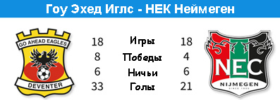 | ГОУ ЭХЕД ИГЛС - НЕК НЕЙМЕГЕН | 5 октября. Девентер. Стадион "Де Аделарсхорст". 21:45. Судья - Бьорн Кёйперс (Олдензал). | | | Два коллектива, располагающихся в нижней части турнирной таблицы. "Неймеген" и вовсе эту таблицу замыкает, имея в активе четыре набранных очка и не имея побед. Так получилось, что к 9-му туру НЕК подходит без побед и с худшей разницей мячей. Смена тренера вроде бы пошла на пользу команде. У руля вместо Алекса Пастора встал Антон Янссен, с которым "Неймеген" и добыл четыре очка. Однако, одержать первую победу так и не удаётся, к тому же в прошлом туре НЕК уступил в принципиальном матче - в дерби Гелдерланда "Витессу". Как и все остальные противостояния этих команд, матч получился боевым и с огромным накалом. Так или иначе, но "Неймеген" дал настоящий бой арнемцам, пусть в итоге и проиграл. Вдвойне обидно потому, что пропустили неймегенцы уже в компенсированное время, хотя вполне могли рассчитывать на ничью. Сейчас НЕКу предстоит очень непростой выездной поединок к новичку элиты "Гоу Эхед Иглс". Интересно в каком состоянии к этому матчу подходят "Орлы", ведь в прошлый уик-энд они были уничтожены амстердамским "Аяксом" со счётом 6:0. Впрочем, на своём поле команда Фуке Боя в этом сезоне ещё не проигрывала и сейчас имеет все шансы эту серию продолжить. Конечно, все серии рано или поздно заканчиваются. Например вчера это подтвердил "Твенте", который нанёс первое домашнее поражение другому новичку элиты - "Камбюру". С другой стороны, "Неймеген" это не "Твенте", а потому шансов на успех у "Гоу Эхед Иглс" всё же побольше.