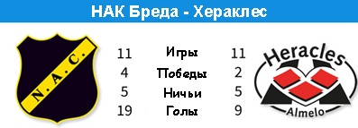 | Статистика встреч: 6-5-11 (32:37) | | Сезон 2012/2013 | | 16.02.2013 НАК Бреда - Хераклес - 1:1 | | 16.09.2012 Хераклес - НАК Бреда - 2:1 | | | | Сезон 2011/2012 | | 11.04.2012 НАК Бреда - Хераклес - 1:2 | | 14.08.2011 Хераклес - НАК Бреда - 2:1 | | | | Сезон 2010/2011 | | 01.05.2011 НАК Бреда - Хераклес - 1:2 | | 26.10.2010 Хераклес - НАК Бреда - 4:1 | | | | Сезон 2009/2010 | | 20.03.2010 Хераклес - НАК Бреда - 3:0 | | 09.08.2009 НАК Бреда - Хераклес - 0:0 | |