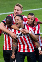 | Уверенная победа над "Херенвеном" со счётом 4:1 принесла ПСВ 22-й титул чемпиона Голландии. Команда Коку стала триумфатором сезона за три тура до его окончания. На следующий сезон ПСВ получил путёвку в групповой этап Лиги чемпионов. Ещё до перерыва эйндховенцы создали комфортный задел, а после него забили ещё раз. Отметим, что это первый титул ПСВ с 2008 года. Клуб из Эйндховена возглавлял таблицу со второго тура и прервал гегемонию "Аякса", который не знал себе равных на протяжении последних четырёх сезонов. Кроме того, ПСВ - самая результативная команда чемпионата (84 гола). Несмотря на ничью в поединке с "Бредой", амстердамский "Аякс" обеспечил себе второе место. А всё потому, что в родных стенах оступиться умудрился "Фейеноорд". Причём проиграли подопечные Рюттена предпоследней команде "Гоу Эхед Иглс". Стоит ли этому удивляться, ведь как правильно аутсайдеры к концу сезона борются за каждое очко. Роттердамцы осложнили себе жизнь. Вроде бы третье место было в кармане, а теперь отрыв от преследователя "Витесса" сократился до четырёх очков, а в розыгрыше ещё девять, так что теоретически всё возможно. Арнемцы вновь продлили свою серию без поражений, разгромив "Дордрехт". Победить, наконец-то, сумел и АЗ. Правда без пропущенного гола команда ван ден Брома всё же не обошлась, зато удалось свести в плюс разницу мячей. Очень важную победу в борьбе за выживание одержал "Хераклес", который дома переиграл "Зволле", а "Утрехт" одолел "Твенте" в заключительном матче тура. "Гронинген" удачно съездил в Тилбург, где разгромил "Виллем", а "Камбюр" и "Эксельсиор" очки поделили. Теперь перейдём к подробностям.