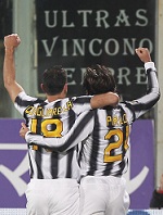 Встреча началась очень неторопливо. Болельщикам чаще всего приходилось свистеть, чем поддерживать ту или иную команду. При этом "Фиорентина" старалась на правах хозяйки больше контролировать мяч и подкатывала на половину поля "Ювентуса". Тот уверенно спокойно защищался и тоже неторопливо вел мяч через десятки перепасовок к чужим владениям. Подобная осторожная с обеих сторон игра не делала ее зрелищной, хотя периодически "Юве" ускорялся и старался уколоть вертикальными выпадами. В результате одного такого на 7-й минуте Вучинич на линии штрафной подкараулил мяч и пробил плотно в угол. Мяч влетел в штангу и полетел обратно, а там уже набегал Матри. Но пробежал мимо мяча, так что бил из неловкого положения и вмазал мимо створа. А после вспышки снова началась осторожная игра. Причем эта осторожность, неторопливость сохраняла напряжение. Постепенно "Ювентус" начал перехватывать инициативу, стал активнее действовать, больше держать мяч и контролировать игру, территорию. Уже почаще игроки в полосатом пробегали центр поля в направлении чужой штрафной, но выходить на ударную позицию было все так же нелегко. Силы в атаку подтягивались небольшие пока. Прощупывал "Ювентус" слабые зоны. "Фиорентина" массивно с подстраховкой защищалась и даже пыталась контратаковать по левому флангу. Оттуда, правда, даже до подач не доходило. Не особенно интересно действовали в атаке хозяева. А гости искали варианты, пасовались поперек поля, переводили мячи с фланга на фланг. И все же нашли пробоину. Причем в едва ли не самом плотном месте у "фиалок". По центру перед штрафной Боруца туринцы сделали несколько коротких быстрых передач, и Вучинич вышел на ударную позицию, мощно метнув мяч в ворота. Кипер не ожидал, что снаряд вылетит из гущи игроков, и даже не среагировал. 0:1. Визуально все выглядело очень легко для "Ювентуса". Туринцы быстро добились преимущества и продолжали вести спокойную игру, атакуя небольшими силами, но очень грамотно, размеренно, защищаясь надежно. Хозяева вперед ходили вроде массивнее, но как-то судорожно, без структуры. Можно отметить штрафной и подачу с него, за которую поборолись "фиалки" у чужих ворот. Но в целом блекло команда смотрелась. А потом положение осложнилось не на шутку. Черчи в центре поля на ровном месте пнул оппонента. Судья не стал церемониться и показал грубияну прямую красную карточку. Так что "Ювентус" еще более уверенно завладел всеми нитями игры и начал уже гонять мяч без сопротивления в свое удовольствие.