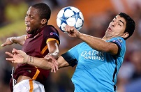 Соперники не стали тратить много времени на разведку и довольно быстро открыли забрала. Сразу с обеих сторон пошли попытки обострить игру, скорости были на должном уровне. Однако со временем всё начало потихоньку становиться на свои места. Месси и компания забрали мяч под контроль и взялись плести свои любимые кружева на чужой половине поля. Без малого полтайма итальянское катеначчо вполне уверенно справлялось с гостевыми выпадами, но на 21-й минуте оборона «Ромы» таки дрогнула. Ракитич, завладев сферой на правом краю штрафной, сместился к лицевой и навесил на дальнюю штангу, откуда одинокий Суарес с полуметра вколотил снаряд в верхний угол – 0:1. Руди Гарсия и его подопечные вступили в споры с судейской бригадой: по их мнению, в момент получения мяча Ракитичем Месси, находившийся неподалёку, нарушал правила против Диня. Рефери, хоть и не без труда, унял разбушевавшихся римлян, а повтор показал, что намеренного фола со стороны Лионеля не было. А спустя буквально пару минут хозяева уже должны были благодарить арбитра. Суарес пробросил мяч мимо Щесны, и голкипер, бросившись в ноги, сбил уругвайца. У Бьорна Кейперса были все основания указывать на «точку» и тем самым, пожалуй, давать «Барселоне» шанс заблаговременно снять вопросы о победителе матча, но голландский рефери не поверил нападающему и потребовал, чтобы тот поднялся с газона. Поймав кураж, «сине-гранатовые», игравшие в этот вечер в голубой форме, бросились добивать раненого соперника, но неудачно проведя пару атак, отошли к своим владениям.