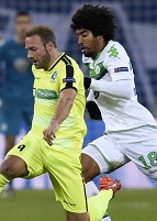 А на 25-й минуте "волкам" удался очень опасный выпад. Арнольд откликнулся на заброс из глубины, оторвался от защитников и из пределов штрафной прострелил на набегавшего одинокого Крузе, но Митрович успел головой прервать эту передачу. Правда, при этом Стефан едва не попал в свои ворота - мяч пролетел в сантиметрах от дальней штанги. "Гент" вслед за этим перехватил инициативу и несколько успокоил игру. На исходе получаса игры Саймон с левого фланга навесил в центр штрафной на Депуатра, который выиграл верховую борьбу, но до мяча не дотянулся. "Гент" планомерно давил, однако оборона "волков" уверенно отбивалась. Гости минут на семь оказались заперты на своей половине поля. Наконец, подопечные Дитера Хекинга смогли развернуть атаку, и игра тут же снова оживилась. Крузе получил отличную передачу на правом фланге, вошёл в штрафную, оставил не у дел защитника и выстрелил с разворота по воротам с острого угла, однако Зельц оказался начеку, а Трешу бельгийцы на добивании сыграть не позволили. И тут же "Гент" развернул быстрый выпад, Депуатр совершил рывок вперёд, однако врезался в Данте прямо на линии чужой штрафной. Впрочем, Моэн не увидел в этом случае блокировки со стороны бразильца, и игра продолжилась. А на 44-й минуте "Вольфсбург" добился своего. Дракслер на левом фланге развернулся вокруг своей оси, изящно обыграв Фокета, обыгрался с Виейриньей и получив передачу в штрафной, пробил точно в дальний угол - 0:1. Бельгийцы духом не упали и ещё до перерыва провели острую атаку - Деягере получил мяч в чужой штрафной, однако защитники не дали ему пробить из выгодной позиции. В этом эпизоде получил болезненную травму Юнг, которого врачи увели с поля под руки, а Себастьяна заменил Шюррле. "Гент" подал в добавленное время два угловых, но ничего из них не выжал. В итоге первый тайм остался за "Вольфсбургом", который провёл такой важный в двухматчевом противостоянии гол на выезде.