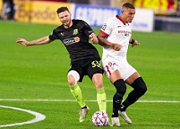Хозяева расставились по 4-3-3 с Эскудеро на левом фланге обороны тройкой Мунир – Окампос – де Йонг впереди. Мусаев отправил Рамиреса на правый край обороны, на флангах атаки вышли Сабуа и Шапи. Классон с Вандерсоном попали в заявку, но готовы были совсем ненадолго. «Севилья» с первых минут начала поджимать. Уже на пятой Эскудеро получил мяч на углу штрафной, откуда зарядил мимо створа. В следующей атаке пришлось уже выручать Сафонову. Окампос мощно приложился из-за штрафной в верхний угол, где не без труда достал мяч голкипер, переведя за лицевую. Еще через пару минут хозяева просили пенальти после падения Хордана. Контакт с Шапи был, но фола Брых не увидел даже на повторе. Еще один плотный удар уже с правого угла штрафной нанес Гудель. Мяч пошел по позиции Сафонова, который спокойно забрал его. А дальше было совсем жарко – Навас хлестко пробил в ближнюю «шестерку» из-под защитника. Сафонов отбил, но в ноги Хордану, который простил «Краснодар», пробив в касание с нескольких метров мимо пустой уже рамки. На исходе трети тайма «быки» огрызнулись отрой контратакой. Уткин отправил в прорыв Берга, которого снес в метре от штрафной Кунде. Желтая карточка и опасный стандарт. Под левую ногу, поэтому Шапи взялся исполнять и сделал это идеально – положил мяч в ближнюю «девятку». Не спасла «Севилью» даже стенка с положенным за ней игроком – выпрыгнули, но не достали. Тут же еще одну массированную атаку провели «быки». Была там пара падений в штрафной, пара блокированных ударов, а в итоге пробивал Шапи с линии штрафной, послав мяч рядом со штангой. Однако пересмотрел Брых повтор и дал пенальти – там действительно Кунде сыграл в ногу Бергу, не успев к мячу. Арбитр еще пожалел защитника, не дав второй «горчичник». Берг с «точки» уверенно пробил в нижний угол. Вацлик угадал направление, но впритирку со штангой шел мяч, и не было шансов спасти. «Севилья» выглядела, мягко говоря, ошарашенной. 0:2 к середине первого тайма – явно не то, чего ожидали хозяева. «Краснодар» заработал еще один стандарт, с которого Олссон забрасывал на дальнюю штангу мяч – никто не успел. Ближе к исходу получаса игрового времени прошел кросс Наваса с правого фланга в центр штрафной, а де Йонг выиграл воздух, но послал мяч по позиции голкипера. Несколько минут спустя еще одна затяжная атака завершилась подачей Наваса – и вновь опасно, потому что Ракитич с подбора пробил под перекладину. Сафонов перевел мяч через перекладину. Ну а Лопетеги сделал двойную замену, сняв Кунде и Эскудеро. Акунья и Оскар появились. «Севилья» явно намеревалась сыграть смелее, поэтому и тренерский штаб «быков» сделал ответный ход, разменяв Сабуа на Сперцяна. Минут за десять до перерыва краснодарцы огрызнулись редкой контратакой, которую Сперцян свежий решил завершить сам, но пробил откровенно неточно. И все-таки во второй волне после розыгрыша корнера хозяева сократили отставание. Хордан набросил мяч справа на ближний угол вратарской, куда вынырнул Ракитич и головой подрезал мяч в дальний угол. В концовке тайма «Севилья» прижала гостей, буквально вдавив их в штрафную. «Краснодар» откровенно играл на отбой, дожидаясь перерыва – паузы и новых указаний. Арбитр накину четыре минуты, и на второй из них прошел кросс в центр штрафной, откуда де Йонг пробил головой по позиции Сафонова. А на последней компенси