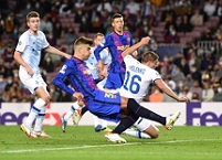 Комбинационный футбол у динамовцев не ладился, мяч не держался даже в центре поля, но в обороне все было довольно дисциплинированно и слаженно, что наверняка нервировало немногочисленных болельщиков, собравшихся на «Камп Ноу». «Барселона» атаковала лениво и методично, а следующий опасный момент создала только после того, как трибуны воодушевились разминкой Ансу Фати: после навеса с левого фланга (очередного) Дест должен был забивать, но ударом в ближний угол позволил проявить себя Бущану. Был назначен угловой, затянувшийся розыгрыш которого оказался результативным: Альба навесил, а оставшийся в штрафной Пике в касание расстрелял Бущана. Почему никто не держал столь опасного защитника? Послематчевый разбор от Луческу будет интересным. За пару минут до перерыва каталонцы и свой второй гол едва не организовали через розыгрыш углового: Депай навесил, Люк де Йонг в уже привычном для себя стиле неточно пробил головой.