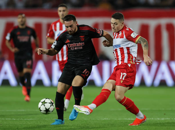 «Бенфика» стартовала в Лиге чемпионов с победы. Команда Бруну Лаже на классе обыграла «Црвену Звезду». Гостям удалось провести быстрый гол уже на 9-й минуте. Так и не перешедший в «Спартак» Керем Актюркоглу на дальней штанге замкнул подачу Александера Баха. А на исходе получаса игры Оркун Кекчю упрочил преимущество «орлов», пробив со стандарта впритирку со штангой. У сербов же до перерыва выделялся Иванич, но первый удар Мирко отразил Анатолий Трубин, а во втором случае игровой снаряд пролетел над перекладиной. После перерыва «Бенфика» заиграла в прагматичном ключе. Гости ничуть не возражали против территориального перевеса соперника, но выбраться на ударные позиции хозяевам не удавалось. В двух эпизодах футболисты «Црвены Звезды» создали остроту с углового, однако в обоих случаях Нассер Джига не сумел подстроиться под мяч. Ближе к концу поединка Анхель Ди Мария едва не довёл дело до разгрома, но послал мяч над перекладиной. И всё же заключительные минуты получились нервными для лиссабонцев. Вышедший на замену экс-нападающий «Пари НН» Фелисио Милсон реализовал выход с голкипером один на один. «Црвена Звезда» пошла на финальный штурм, однако гости отбились. Егор Пруцев же у хозяев на поле так и не появился. «Бенфика» добилась победы малой кровью, хотя пассивная игра во втором тайме и обернулась для «орлов» пропущенным голом. Лиссабонцы одержали вторую победу при новом тренере Бруну Лаже. Перспективы же «Црвены Звезды» в Лиге чемпионов становятся призрачными, ведь впереди у них выездные поединки с «Интером» и «Монако». ![]() Фото - Getty Images Предыстория. В поединке между «Црвеной Звездой» и «Бенфикой» фаворитами вроде бы выглядели гости. Однако «орлы» в нынешнем сезоне на выезде ещё не выигрывали. В гостевых матчах чемпионата Португалии они набрали лишь один балл, уступив «Фамаликану» (0:2) и сыграв вничью с «Морейренсе» (1:1). Такие результаты обернулись для Роджера Шмидта отставкой. Главным тренером команды стал Бруну Лаже, и в его дебютной игре «Бенфика» разгромила «Санта Клару» (4:1). В турнирной таблице Примейры «орлы» пока идут на пятом месте. Что же касается «Црвены Звезды», то она во внутренней лиге единолично лидирует, набрав 19 очков из 21 возможных. В выходные команда Владана Милоевича убедительно обыграла дома «Напредак» (2:0). В Лигу чемпионов «Красная звезда» пробилась через квалификацию. В раунде плей-офф «Црвена Звезда» уступила в Норвегии «Будё-Глимту» (1:2), но в ответном домашнем матче победила с нужным счётом (2:0). Ранее соперники пересекались лишь однажды, и случилось это в сезоне-1984/85. Тогда в Кубке европейских чемпионов «Црвена Звезда» дома одержала победу в результативном поединке (3:2), но в гостях уступила (0:2). В родных стенах «Красная Звезда» и сейчас способна создать сложности кому угодно. В отчётной встрече Владан Милоевич мог рассчитывать на всех сильнейших, за исключением Владимира Лучича. У «Бенфики» же отсутствовали Тьягу Гувейя и Ренату Саншеш. Ход матча. Обе команды избрали схему 4-2-3-1. У «Црвены Звезды» на острие нападения был выдвинут Дуарте, под ним расположились Олайинка, Иванич и Силас. Опорную зону заняли Элшник и Крунич. У «Бенфики» атакующую группу образовали Павлидис, Актюркоглу, Рольхейсер и Ди Мария. В центре обороны вышли Силва и Отаменди. Пруцев и Дркушич начали встречу в запасе. «Бенфика» активно