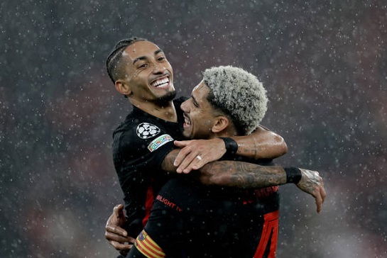 После таких матчей говорят, что видели всё. Наверное, только бушевавшая в Лиссабоне стихия помешала в полной мере болельщикам насладиться той феерией, которая разворачивалась в матче 7-го тура общего этапа Лиги чемпионов между «Бенфикой» и «Барселоной». А вот телезрители таких проблем не испытывали, хотя и фанаты «орлов», и «кулес» сине-гранатовых вполне могли отхватить не по одному инфаркту за время просмотра. Наверное, именно после таких встреч кто-то из неопределившихся начинает болеть за ту или другую команду, потому как впечатление просто огромное. Пожалуй, до 78-й минуты никто не сомневался в победе «Бенфики», которая вела в два гола. После 87-й, когда «Барселона» сравняла, уже никто не сомневался в ничьей, потому что сил у соперников, как казалось, не осталось. Но в оставшееся время мы вполне могли увидеть победу «Бенфики» с голом ветерана Ди Марии, а вместо этого увидели сверхволевую победу «Барсы» с голом Рафиньи на 6-й компенсированной минуте из четырех. Более того, еще больше интриги в игру добавил ВАР, взявший паузу после пятого гола, ведь могло быть не только отменено взятие ворот Трубина, а еще и назначен пенальти уже в ворота Щенсны. Но нет. «Бенфика» практически лишается шансов на топ-8, а «Барселона» досрочно гарантирует себе 1/8 финала. ![]() Фото - Getty Images Предыстория. В национальных первенствах и «Бенфика», и «Барселона» идут в топ-3, но есть, как говорится, нюанс. Лиссабонцы отстают всего на 3 очка от лидирующего «Спортинга», тогда как каталонцы проигрывают уже 7 очков «Реалу», хотя еще вроде недавно вели у мадридцев в 9 баллов. Но так бывает. В Лиге чемпионов все наоборот. Здесь подопечные Ханса-Дитера Флика с 15 очками уступают только «Ливерпулю», который под руководством Арне Слота громит всех направо и налево, не потеряв ни балла. Зато «Барселона» забила больше всех голов (21) и имеет на начало 7-го тура общего этапа лучшую среди всех команд разницу (+14). Португальцы таким похвастать не могут. В активе коллектива Бруну Лаже 10 очков и столько же забитых голов, а это результаты за пределами топ-8. Правда, для «орлов» еще ничего не потеряно и две победы, особенно если они будут с крупным счетом, теоретически могут принести заветное место в первой восьмерке команд, что приведет к пропуску стыков перед матчами плей-офф. Что же касается «Барселоны», то у нее еще есть теоретические шансы оказаться в стыках, а не выйти в 1/8 финала напрямую, но для этого нужно не победить в обоих турах, плюс чтобы конкуренты идеально отыграли свои встречи. В сегодняшнем поединке хозяевам не помогут травмированные Саншеш и Гувейя, тогда как у гостей не сыграют тер Стеген, Мартинес, Берналь и Ольмо. Также стоит отметить, что последняя победа «Барселоны» над «Бенфикой» была 12 лет назад, а с тех пор в трех встречах сине-гранатовые не могут даже забить, хотя исторически итог в их пользу: В3 Н4 П2. Ход матча. Футболисты «Бенфики» и «Барселоны» с первых минут бросились радовать болельщиков. Ямаль нанес первый удар в створ ворот на второй минуте, а хозяева на этой же минуте забили. Диагональ из центра прошла налево на Каррераса, которого не опекал сместившийся ближе к центру защиты Кунде. Левый бек лиссабонцев пробежал к чужой штрафной и прострелил. Шельдеруп не стал цепляться за мяч, пропустив его мимо, где дальше метров с 8 Павлидис, отодвинув корпусом Кубарси, сходу п