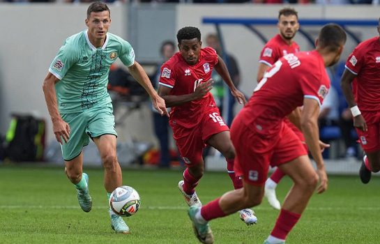 Сборная Беларуси наконец-то одержала первую победу в 2024-м году, прервав пятиматчевую безвыигрышную серию. Команда Карлоса Алоса заработала 3 очка в Люксембурге в рамках 2-го тура Лиги наций. Белорусы активно начали встречу, но дальше инициатива надолго перешла к хозяевам поля. Люксембуржцы много времени проводили с мячом и по ходу первого тайма вполне могли открывать счёт, однако они не использовали пару многообещающих моментов. После перерыва ситуация на поле изменилась. Футболисты сборной Беларуси перешли к более решительным атакующим действиям и начали чаще угрожать владениям Мориса. По ходу заключительного отрезка второго тайма гости организовали взятие ворот люксембуржцев. Сработала одна из замен Алоса. Громыко после передачи Печенина эффектным обводящим ударом поразил хозяйские владения и принёс белорусам 3 очка. Команда Алоса имеет в активе 4 балла после двух проведённых матчей в текущем розыгрыше Лиги наций. А вот Люксембург остаётся без заработанных баллов и утвердился в статусе аутсайдера квартета. ![]() Фото - Прессбол. Предыстория. Сборная Беларуси начала своё выступление в Лиге наций с безголевого ничейного результата в игре с Болгарией, проходившей на нейтральном поле в Венгрии. Болгары на протяжении большей части матча владели заметным преимуществом и создали предостаточно опасных моментов, но пробить Лапоухова у них не получилось. По ходу второй половины встречи Болгария осталась в меньшинстве из-за удаления Крастева, однако белорусы не смогли эффективно распорядиться численным перевесом. Команда Алоса в 2024-м году ещё не побеждала. Разумеется, она надеялась прервать безвыигрышную серию в Люксембурге. Люксембуржцы, в свою очередь, в стартовом туре уступили Северной Ирландии в Белфасте со счётом 0:2. Они крайне неудачно начали четверговый матч, пропустив 2 мяча уже к 17-й минуте от североирландских центральных защитников Макнейра и Балларда, и не смогли исправить ситуацию. Так что, команде Хольца было важно у себя дома добиться положительного результата в противостоянии с белорусами, чтобы после сентябрьских матчей не утвердиться в статусе аутсайдера группы. Ход матча. Хольц сделал 4 изменения в стартовом составе по сравнению с матчем против Северной Ирландии. Вместо Махмутовича, Жерсона, Вейги и Родригеса с первых минут появились Джогович, Шано, Муратович и Синани. Зато свою позицию в стартовой обойме сохранил полузащитник “Спартака” Мартинс. Алос, в свою очередь, совершил 3 перестановки в основном сочетании по сравнению с игрой против Болгарии. Ковалёва, Капленко и Яблонского сменили Карпович, Селява и Бахар. Из представителей РПЛ в стартовом составе белорусов появились Волков и Печенин. Гости активно начали встречу. На первых минутах они много времени проводили на чужой половине поля и заработали несколько перспективных стандартных положений, розыгрыши которых ничем примечательным не завершились. А вот первая толковая атака люксембуржцев в матче увенчалась акцентированным ударом со “второго этажа” в исполнении Бонерта, с которым не без труда справился Лапоухов. Свой дебютный угловой в матче футболисты сборной Люксембурга также разыграли не лучшим образом. После довольно скромного старта команда Хольца постепенно перехватила инициативу и стала заметно чаще соперника контролировать мяч. Л