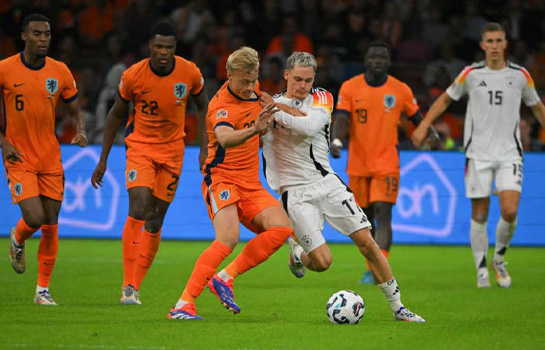 Сложно дать однозначную оценку итоговому результату, но он кажется все-таки справедливым. Потому что обе команды проявляли себя на разных отрезках матча, а в другие выглядели блекло и беспомощно. Например, дебют остался полностью за Нидерландами. Они забили уже на второй минуте и создали еще серию моментов, пока у Германии совсем не клеилось впереди ничего. Но немцы неожиданно преобразились в конце первого тайма. Им за несколько минут удалось забить дважды. А голландцы к тому же потеряли Аке из-за травмы. Но хозяева собрались и в дебюте второго тайма тоже сумели отличиться голом, вернув равный счет. Можно было ожидать развития от Нидерландов, однако они как-то притихли, видимо, устав. А Германия оживилась и концовку матча провела более динамично и напористо. Правда, без обилия голевых моментов. Так что в сухом остатке ничья справедлива. ![]() Фото - УЕФА. Предыстория. Группа 3 высшего дивизиона Лиги Наций не выглядит интригующе. Тут есть два явных фаворита, которые точно разыграют первое место. Даже стартовый тур это показал наглядно. Германия в нем разгромила Венгрию со счетом 5:0, а Нидерланды взяли верх над Боснией и Герцеговиной (5:2). Два разгрома, в обоих случаях победитель забил по пять мячей. Да и при всех проблемах Германии с Нидерландами они кажутся убедительнее того, что могут предложить венгры и боснийцы. Тем интереснее очная встреча потенциальных лидеров. Стоит напомнить, где те закончили последний Евро. Оба оступились в плей-офф на финалистах. Нидерланды проиграли Англии (1:2), а Германия в дополнительное время драматично уступила Испании (1:2). Истории в чем-то похожие. Между собой Германия и Нидерланды встречались в этом году в товарищеском матче. Весной немцы были сильнее со счетом 2:1. Предыдущий товарищеский матч в 2022 году закончился ничьей (1:1). А в 2019-м в отборе они обменялись гостевыми победами. Ход матча. Матч начался обескураживающе для Германии. Уже на второй минуте хозяева смогли открыть счет. Причем атаку Нидерландов начал вратарь. После выноса Вербрюггена мяч подхватил Гравенберх, который заметил рывок Рейндерса и отправил его проникающим пасом один на один с тер Штегеном, и Тиджани не подкачал. 1:0. Быстрый гол добавил злости на поле, и соперники сразу стали обмениваться грубыми приемами. Но стандарты не приносили остроты. Зато из сумбура чуть не случился ответный гол Германии. Вирц теперь мог выскочить к воротам, но в борьбе с защитником замешкался, и Вербрюгген успел подстраховать партнеров, выйдя далеко из ворот. Немецкая команда попыталась перехватить инициативу, что было логично. Однако «оранжевые» неплохо защищались. И в контратаке посадили на желтую карточку Шлоттербека, который сбил Симонса. Разыграли стандарт хозяева очень остро, навес нашел Думфриса на ударной позиции, но он умудрился не попасть в створ. Эпизодически оборона Германии куда-то проваливалась в небытие. Потому что еще через несколько минут уже сам Симонс прорывался с фланга в штрафную. Показалось, что он упустил момент для удара в единоборстве, однако сумел изловчиться и протолкнуть мяч в направлении дальнего угла. Повезло гостям, что тер Штеген не потерял бдительность и парировал удар. Но еще одну желтую карточку схватили немцы. Теперь наказан был Та. Он не усмотрел за юрким Бробби и сбил того в центре поля, откровенно срывая контратаку. Не л