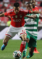 Центральный матч 3-го тура состоялся на "Эштадиу да Луж". В лиссабонском дерби сошлись "Бенфика" и "Спортинг". Обе команды подходили к очному противостоянию не имея поражений. "Орлы" в стартовых двух турах набрали максимальное количество очков, а "львы" допустили осечку в поединке с "Академикой", упустив победу в компенсированное время. Впрочем, уже в следующем туре команда Марку Силвы реабилитировалась и обыграла "Ароку", правда снова в дополнительное время. На бумаге фаворитом конечно же была "Бенфика", а на деле получилась равная обоюдоострая игра с обилием опасных моментов. Плохой матч провёл голкипер "Бенфики" Артур. Не исключено, что уже в следующем туре место в рамке займёт его соотечественник Жулио Сезар, перешедший в стан "Орлов" совсем недавно и находившийся на замене в этом матче. Изменений в обороне Жоржи Жезуш делать не стал. Пару центральных как всегда составили Луизао и Жардел, а на флангах расположились Макси Перейра и автор победного гола в прошлом туре Элисеу. Зато в срдней линии без перестановок не обошлось. Во-первых, надолго из строя выбыл Рубен Аморим, который в прошлом туре порвал крестообразные связки колена. Зато вернулся в составе Энцо Перес. Место же Аморима в центре занял Андре Алмейда. В остальном сюрпризов ждать не пришлось. Андерсон Талиска составил пару форвардов Лиме, а помогали им Гайтан и Сальвио. У "Спортинга" в стартовый состав вернулся Вильям Карвалью, отсидевший одноматчевую дисквалификацию. Напомним, что в матче 1-го тура главная звезда "Спортинга" был удалён с поля за две жёлтые карточки. Ещё одно изменение коснулось линии атаки. Не забивающий Фреди Монтеро вновь уселся на лавку, а на его месте на острие атаки вышел Ислам Слимани. С этим выбором Марку Силва явно не прогадал, а Монтеро вновь рискует проиграть конкуренцию алжирцу и надолго сесть в запас. Активнее матч начали гости, которые уже в дебюте заработали угловой. Именно с него и началась беды голкипера "Бенфики" Артура, который неудачно сыграл на выходе, но, к его счастью, попасть в створ Слимани не сумел. Подачу же выполнял Джефферсон. Ответа хозяев долго ждать не пришлось. Буквально в следующей атаке уже "Бенфика" получила право на стандарт в виде штрафного. Интересно, что к мячу подошёл 20-летний Андерсон Талиска. Бразилец перешёл в стан "Орлов" только в этом сезоне из бразильского клуба "Баия" и уже завоевал доверие на выполнение подобных штрафных, с учётом того, что в "Бенфике" есть Гайтан. Именно его удар со штрафного и привёл к первой угрозе ворот Патрисиу. Капитану "Спортинга" пришлось вступать в игру и переводить мяч на угловой, поскольку снаряд летел под перекладину. Уже следующая атака "Орлов" привела к взятию ворот. Казалось, эта атака не должна приводить к чему-то опасному, поскольку на правом фланге атаки "Бенфики" у гостей было численное преимущество - четыре против трёх. Здорово себя проявил Эдуардо Сальвио, который легко развернулся и ушёл от Джефферсона. А в этот момент из под опеки сумел свободиться Макси Перейра. Грубейшая позиционная ошибка обороны "Спортинга" привела к тому, что Сальвио увидел рывок своего партнёра в штрафную и сделал передачу между двух оппонентов. Уругваец получил мяч и откатил его под удар на Гайтана. Аргентинец, в свою очередь, без промедления в касание пробил в ближний угол. Таким образом, Патрисиу был пойман