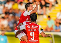 Осечками "Порту" и "Спортинга" с удовольствием воспользовалась "Брага", которая гостила у "Ароки" и победила со счётом 6:0. Первый свой гол "оружейники" забили на первой же минуте, когда отличился Симон Банза. Французский нападающий с передачи Юри Медейруша забил свой уже пятый гол в сезоне. Новичок "Браги" лидируют в гонке бомбардиров. На 4-й минуте капитан красно-белых Рикарду Орта забил свой первый гол в сезоне. Он перехватил мяч на левом фланге, сместился чуть в центр и нанёс шикарный удар в дальний угол, с которым уругвайский голкипер "Ароки" Игнасио Де Арруабаррена справиться не сумел. На 40-й минуте Рикарду Орта реализовал пенальти и оформил дубль. А на 44-й минуте отличился и Витинья. Симон Банза подхватил мяч в центральном круге, продвинулся вперёд и выдал тонкий пас на партнёра. Витор Оливейра или попросту Витинья избежал офсайда, обыграл голкипера и закатил мяч в сетку. Во втором тайме подопечные Артура Жорже действовали менее активно, но ещё парочку голов сумели забить. На 67-й минуте сработала связка футболистов, вышедших на замены. Абель Руис вывел на ударную позицию Андре Каштру, а тот в одно касание метров с 23-х вколотил мяч в цель. Точку в разгроме поставил Диего Лайнес, который забил дебютный гол за "оружейников", воспользовавшись передачей Абеля Руиса. "Брага" набрала 10 очков и забралась на вершину. У "Ароки" 6 баллов и 10-я позиция.