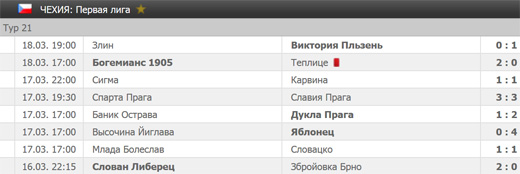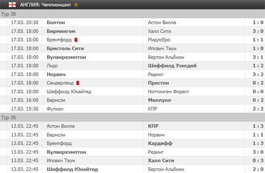Центральный матч тура был сыгран в Праге. «Спарта» выдала первый достойный матч после увольнения Страмаччони. Хозяева очень мощно провели первый тайм. К перерыву чемпион крупно уступал, и в воздухе витал аромат сенсации. Дубль Станчу и автогол Соучека поставили «Славию» на грань, однако во втором тайме гости проявили недюжинный характер. На экваторе тайма Стох начал камбэк, Дели за несколько минут до конца продолжил, а на последней минуте чемпион заработал пенальти, уверенно реализованный Шкодой. Ничья позволила «Викории» вернуть отрыв в девять очков при матче в запасе. «Виктория» отыграла 120 тяжелейших минут в плей-офф Лиги Европы, уступив дорогу «Спортингу». Собраться на «Злин» было непросто, но ранний гол Коларжа помог увезти победу на классе. «Сигма» осечками конкурентов не воспользовалась, расписав мировую с «Карвиной». Команды обменялись голами на экваторе второго тайма. «Высочина» и «Яблонец» выдали суперстарт по весне, добыв по четыре победы. Но в очной встрече кто-то должен был уступить. Рвущийся к медалям «Яблонец» разнес клуб Левина, который вновь отыграл все 90 минут, но помочь команде уйти от разгрома не сумел. Гостям хватило тайма, чтобы пробить оборону «Высочины» трижды, а за полчаса до конца Масопуст оформил дубль, забив четвертый. Комличенко вышел в стартовом составе «Млады Болеслав» в матче с другим аутсайдером «Словацко» и на исходе получаса игрового времени вывел свою команду вперёд. Однако удержать победу «болке» не удалось – гости спаслись в концовке. Базелюк появилась на поле только за пятнадцать минут до конца, когда его «Збройовка» уже горела в два мяча «Словану». Помочь команде уйти от поражения россиянину не удалось. Дубль Пулкраба ещё в первом тайме решил исход встречи в пользу «Слована». Кабаев вышел просто потянуть время – «Богемианс» вел в два мяча, а «Теплице» заканчивал вдесятером. «Баник» проиграл очередную битву в войне за жизнь. «Дукла» забила по голу в каждом из таймов, а хозяева лишь размочили счёт на последней минуте усилиями Бароша. Теперь от спасительного 14-го места клуб из Остравы отстает уже на восемь очков. Результаты Таблица Чемпионшип. 38 тур и перенесенные матчи 35 тура. «Астон Вилла» отказывается от прямой путевки в АПЛПосле яркого разгрома лидера «Астон Вилла» в перенесенном матче 35 тура всё испортила, опростоволосившись с «КПР». «Обручи» забили быстрый гол, а затем идеально разыграли контратакующую модель. К концу встречи «вилланы» горели в три мяча, сумев лишь уйти от разгрома на флажке. А «Вулверхэмптон» очередного унижения от конкурента не заметил, без проблем разгромив чахнущий «Рединг». Латераль Доэрти оформил дубль. «Кардифф» тоже выиграл уверенно. «Лазурных птиц» не смутил гол, пропущенный уже на пятой минуте в Брентфорде. На экваторе тайма валлийцы отыгрались, в раздевалку забили второй, а за полчаса до конца провели и третий, избавив себя от проблем в концовке. «Халл» неожиданно прорвало в гостях у «Ипсвича» - два «тигры» забили ещё до перерыва, из раздевалки оформив разгром. Застрявший в середине таблицы «Норвич» довольствовался лишь ничьей в Барнсли, а «Шеффилд Юнайтед», продолжающий цепляться за место в плей-офф, уверенно обыграл другого аутсайдера – «Бертон». В 38 туре КПР снова удивил, отобрав очки у «Фулхэма». Хозяева вели в два мяча, забив второй в раздевалк