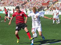 Надо отдать должное хозяевам. Их такое развитие событий не подкосило. Они продолжили играть спокойно и уверенно, и уже через 4 минуты снова вышли вперёд. Причём комбинацию разыграли как по нотам. Хозяева бросили в прорыв по левому флангу Бурмистрова, который отпасовал прямо в район одиннадцатиметровой отметки, откуда набежавший Ребко послал круглый снаряд снова всё в тот же угол от вратаря. Нельзя сказать, что после второго пропущенного мяча ЦСКА прижал "Амкар" к своим воротам. Но до штрафной пермяков армейцы добирались регулярно, то и дело зарабатывая угловые. Но "Амкар" играл в защите очень цепко и раз за разом отводил угрозу от своих ворот. Не забивали хозяева и об атаке. На 28-ой минуте только удача и мастерство Акинфеева помогли армейцам уберечь на этот раз свои ворота. Бурмистров вышел один на один с вратарём, но Игорь сблизился с форвардом, сократив угол обстрела, и отбил мяч ногой. ЦСКА ответил на этот момент дальним выстрелом Цауни, которому лишь слегка не хватило точности. Армейцы продолжали нагнетать давление у ворот хозяев, активно используя фланги. В течение пяти минут у гостей могли отличиться Цауня, Дзагоев, Игнашевич, Щенников. Но либо в последний момент подставлял ногу кто-то из защитников "Амкара", либо удары у бьющих как следует не получались. На 38-ой минуте ещё одна неприятность случилась с гостями. Получившего повреждение Сейду Думбия Слуцкому пришлось заменить на Секу Олисе. И это именно в тот момент, когда армейцам "кровь из носу" нужно было отыгрываться! Однако, уже через три минуты преимущество хозяев выросло в два мяча. Это Ребко после розыгрыша штрафного дальним ударом сумасшедшей силы буквально вколотил мяч в дальнюю "девятку". Акинфеев здесь ничего уже поделать не мог, хотя и слегка зацепил мяч рукой. Искорка надежды мелькнула для ЦСКА на последней минуте тайма, когда Гаглоев снёс активного Цауню в штрафной и судья назначил пенальти. Хонда взялся исполнять этот штрафной, но пробил не совсем уверенно и Нарубин намертво взял мяч. На этом первый тайм, событий в котором с лихвой хватило бы и на весь матч, завершился.