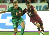 «Терек» вышел в привычном составе. После 4:0 вряд ли есть смысл что-то менять. Билялетдинов же свои построения существенно пересмотрел. На лавке остался проваливший прошлый матч Бурлак, место которого занял ветеран Навас. Сама схема также оказалась более осторожной. На этот раз с двумя нападающими решили сыграть казанцы, уплотнив за счёт этого среднюю линию, где появился Вакассо. Начало матча выдалось спокойным. Обилие единоборств не способствовало высокому темпу. «Терек» на правах хозяина старался завладеть мячом и инициативой, но кроме незначительного территориального преимущества эти попытки ничего хозяевам не принесли. Казанцы, получая мяч, старались проводить быстрые атаки, уповая на скоростные качества и технику своих лёгких форвардов. Но все эти задумки на корню пресекались обороной. Игра получалась вязкая, а до ворот мяч попросту не доходил. Вся надежда оставалась на стандарты, но не ладились и они. Раз за разом передачи прерывались, или просто не получались у атакующих. Виной тому была отчасти жаркая погода, не позволявшая футболистам играть с полной выкладкой. Перевеса «Терека» хватало лишь на полумоменты. Пару раз почти выскакивали на ударную позицию грозненцы, но хорош был Кверквелия, прочитывавший передачи и в чистых подкатах выбивавший мяч. В середине тайма Аилтон пробовал после сольного прохода проверить Рыжикова, но несильный удар бразильца стал лёгкой разминкой для голкипера. Грозненцы поддавливали, «Рубин» же практически окопался у своей штрафной, изредка проводя контратаки. В одной из них Вакассо удался хороший пас на Азмуна, но форвард крайне неудачно обработал мяч на углу вратарской, и шанс для удара был упущен. На исходе получаса Рыбус сорвал другую атаку казанцев, прихватив убегавшего Набиулина, за что был награждён предупреждением. До конца тайма оставалось ещё минут пятнадцать, и арбитр сжалился над командами, устроив водопой. Сразу после возобновления игры Азмун обокрал защитника и сразу пробил из-за пределов штрафной – мимо створа. Хозяева продолжили неторопливое позиционное наступление, как будто рассчитывая, что «Рубин» забьёт себе сам. Прошел всё же в одном из эпизодов пас подключившегося к атаке Кудряшова на Аилтона, и тот бил сходу в ближний угол. Рыжиков сыграл надёжно. За несколько минут до перерыва Адилсон и Азмун что-то не поделили в центре поля, за что удостоились получить от Николаева по предупреждению. А вскоре после этого «Рубин» упустил свой самый реальный шанс. Канунников заработал перспективный штрафной. Исполнявший его Оздоев как раз на Максима и сделал передачу, а тот не сумел как следует пробить. Но мяч отскочил точно в ноги Азмуну, где его и накрыл Годзюр.