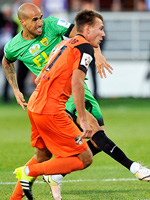 В центральном матче тура «Краснодар» и «Ростов» выдали настоящий триллер. Большую часть времени игра шла по сценарию ростовчан. Они забили уже на десятой минуте, удачно разыграв угловой. Навас замкнул подачу Калачева от угла поля. Дальше «быки» давили на правах хозяев и проигрывающих, «Ростов» отбивался, отвечая контрвыпадами. На вязком от ливня поле команда Шалимова ничего не могла поделать с обороной дончан. После перерыва картина поменялась мало. Контратаки гостей по-прежнему смотрелись острее позиционного наступления «быков». Когда же показалось, что «Ростов» своего уже не упустит, «Краснодар» неожиданно изыскал внутренние резервы. За три минуты до конца разыграли мяч на фланге хозяева, и Газинский вырезал подачу на Смолова. Наверняка бил Федор в нижний угол, однако Джанаев каким-то чудом успел сложиться и отбить. Прямо в ноги обретавшемуся рядом Налдо, который внес мяч в сетку. А уже в компенсированное время Лаборде рванул в штрафную, где рухнул после минимального контакта с Мевлей. Пенальти, четко реализованный Смоловым. В равной игре удача оказалась на стороне «Краснодара», который и в прошлом сезоне вырвал у «Ростова» победу с тем же счетом также на флажке.
