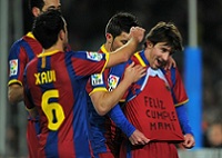 Игра сразу же пошла по сценарию принимающей стороны. Уже на 2-й минуте Педро записал на свой счет гол в ворота Тоньо с паса Месси. Там, кстати, возникли серьезные подозрения на офсайд. Такое начало сразу же намекнуло на то, как будут дела разворачиваться дальше. Каталонцы добились процента владения мячом, варьировавшегося между 70-тью и 80-тью, они полностью владели территорией, мячом, варьировали темп и направление атак, постепенно найдя самое острое место – левый фланг и центр, куда и кололи беспрестанно. «Расинг» защищался количеством и жесткостью. Иногда это приводило к опасным штрафным, а однажды – к пенальти. Месси его реализовал. Лишь к концу тайма расшевелился спавший беспробудно «Расинг». Была создана серия моментов, но оборона и Вальдес с ними справились. В целом, первый тайм завершился очень ожидаемо и предсказуемо. Второй тайм гости начали с тактических новаций в виде применения жесткого пресса в центре поля. Это имело эффект недолго. Каталонцы быстро приспособились и наказали оппонента голом-красавцем. Авторство записал на себя...  |