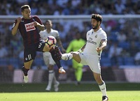 Зинедину Зидану пришлось перед встречей вносить экстренное изменение в стартовый состав - Родригес получил травму на предматчевой развминке, и вместо него в основе вышел Ковачич. Хозяева ожидаемо сразу же прибрали мяч себе. На 4-й минуте Бэйл отметился первым ударом по воротам в поединке, послав мяч в "сетку" с внешней стороны. Однако и гости не тушевались и очень скоро неожиданно открыли счёт. Леон с правого фланга навесил в центр штрафной, откуда Рико головой пробил точно в правый нижний угол - 0:1. Интересно, что организовали гол в ворота "Реала" его воспитанники. Пропущенный гол заставил активизироваться хозяев, которые в дебюте поединка матча действовали несколько вальяжно. Оборона "Эйбара" застегнулась на все пуговицы - ни Бэйл, ни Бензема не смогли прорваться в чужую штрафную. "Сливочные" подали несколько угловых, но и из них ничего не выжали. На 17-й минуте Бэйл навесил в штрафную, однако защитники не позволили Бензема нанести удар. Впрочем, хозяева тут же и додавили "оружейников". Роналду раскачал на левом фланге Капу и с края штрафной навесил на дальнюю штангу, откуда набежавший Бэйл в упор пробил в противоход голкиперу - 1:1. Сравняв счёт, хозяева потеряли бдительность, за что их едва не наказали гости. Леон обыграл соперника и ворвался в штрафную, после чего пробил в ближний угол, но Навас отразил угрозу.