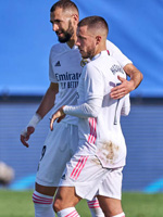 Насколько все плохо у мадридского «Реала» в Лиге чемпионов – настолько хорошо в Примере. Да, «сливочные» еще не первые и даже по потерянным очкам проигрывают соседям из «Атлетико», но «эль класико» выиграно и перспективы неплохие. Поднять настроение заехала и «Уэска», на которой размялись перед третьим туром еврокубков. Первый гол, кстати, забили гости, но мяч Мира был отменен из-за офсайда. До 40-й минуты ничего не предвещало беды для команды Мичела, но потом дуплетом выстрелили Азар и Бензема. Восстановившийся после травмы Эден нанес шикарный удар метров с 30 под левую штангу, а Карим забил с края вратарской после навеса справа от Лукаса Васкеса. Игра на этом, в принципе, была сделана. Для уверенности после перерыва «сливочные» довольно быстро оформили разгром, когда уже сам Бензема ассистировал Вальверде. За 15 минут до конца основного времени Давид Феррейро наказал пару центрдефов «Реала», откликнувшись на линии вратарской на подачу слева от партнера, но разгром все же состоялся. Бензема оформил дубль ударом головой с линии вратарской после скидки от Винисиуса и отскока мяча от газона.