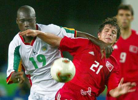 Сборная Турции остановила восхождение Сенегала к вершинам мирового футбола, обыграв африканскую сборную благодаря "золотому" голу Ильхана Маншиза. Впрочем, в любом случае, Сенегал стал одним из главных открытий первенства, хотя и не стал первой африканской командой, вышедшей в полуфинал чемпионата мира. А вот Турция впервые в своей истории имеет реальный шанс завоевать медали чемпионата мира. В полуфинале турецкая сборная играет с Бразилией, которой из-за спорного пенальти проиграла в групповом раунде со счетом 1:2. В другом полуфинале сборная Кореи в Сеуле принимает сборную Германии. Полуфинальные матчи состоятся 25 и 26 июня. Первый тайм матча Сенегала и Турции можно разделить на три этапа. В первые 15 минут преимуществом владели турки. Затем последовала десятиминутка сборной Сенегала, которая за это время упустила три стопроцентных голевых момента. И, наконец, вторая половина тайма прошла под диктовку турок, но фатально не везло Хакану Шукуру. Отбившись от стартовых атак сборной Турции африканцы на 19-й минуте упустили реальный голевой момент. Фадига после массированной атаки бил практически в упор, но путь мячу на линии ворот преградил... Анри Камара. Спустя четыре минуты вновь Фадига с близкого расстояния бил в верхний угол, но мяч попал во внешнюю сторону сетки. На 25-й минуте сенегальцы упускают еще один стопроцентный голевой момент. На 27-й минуте после передачи Хасана Шаша Хакан Шукур, находясь у пустых ворот, не сумел обработать мяч. В этим минуты турки завладели большим преимуществом, но вновь два выгодных момента не реализовал Хакан Шукур. На 38-й минуте после прострела Эргюна несчастный Хакан Шукур вновь не попадает в пустые ворота. За минуту до перерыва после удара Бастюрка защитник Даф выносит мяч с линии ворот, а в следующий атаке выгодный момент не реализовал Диуф. Во втором тайме опасных и голевых моментов стало значительно меньше. Сенегальцы преимущественно оборонялись, а турки владели большим территориальным преимуществом. На 77-й минуте Бастюрк и Ильхан убежали к воротам Тони Сильвы, но первый неточным пасом испортил голевую атаку. А на последней минуте последовала одна из редких контратак Сенегала, но у Камара из выгодной позиции не получился удар. Судьба матча решилась на первых минутах дополнительного времени. Давала Юмит промчался по правому флангу и прострел в центр штрафной на Ильхана, который с близкого расстояния расстрелял ворота соперника.